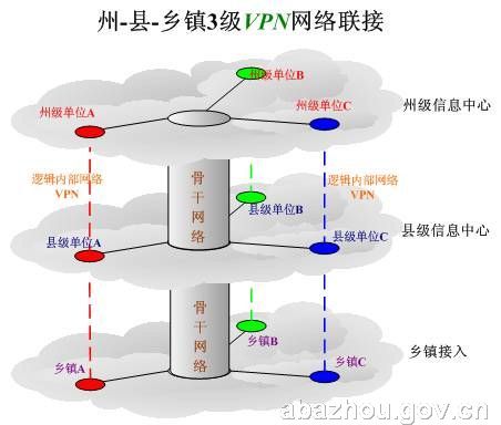 阿坝州电子政务外网采用“王”字型广域网络结构,电子政务外网采用核心层、汇聚层、接入层典型的三层结构,各个接入单位的局域网构成用户层。核心层使用ATM链路,完成各个节点之间的数据交换,汇聚层完成各接入用户的数据汇总,通过一条线路送到骨干层。我州电子政务外网采用VPN技术。通过VPN服务,为各个接入单位实现透明的“纵网”联接;并通过VPN 技术建设“横网”。各个“纵网”之间实现了IP地址的重叠,原则上“纵网”保留其系统内部规划的IP使用方案。