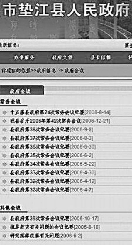 昨天,垫江县政府对此回应称,2008年之后,按上级要求,县政府常务会议纪要不再以这种方式公开。目前,该县政府网正准备取消该栏目。
