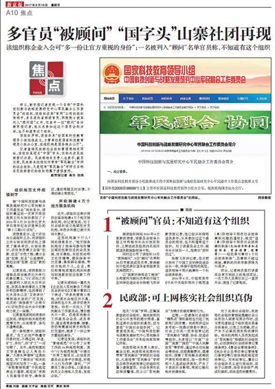 8月18日,新京报刊登报道《多官员“被顾问” “国字头”山寨社团再现》,曝光一个自称“中国科技创新与战略发展研究中心军民融合工作委员会”的组织,虽冠名“国字头”,却未在民政部登记注册,一位被列入其“顾问”名单的退休官员表示“不知道有这个组织”。