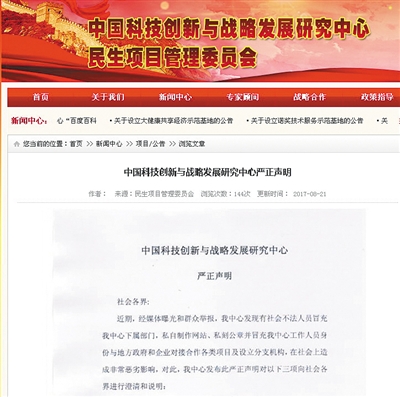 “中国科技创新与战略发展研究中心”在其“下属机构”——民生项目管理委员会网站发布声明,否认两家组织与其所属关系。