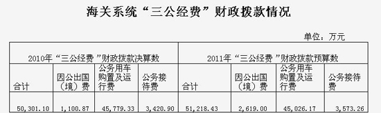 2010年,经财政部报全国人大核准的全国海关公务接待费财政拨款预算3578.02万元,实际执行3420.90万元,2011年财政拨款预算3573.26万元,均严格按中央政策规定执行。
