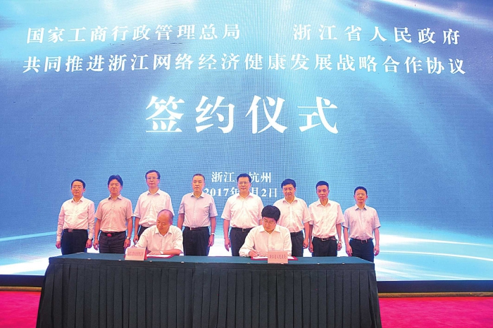 9月2日,国家工商总局与浙江省政府在杭州签署《关于共同推进浙江网络经济健康发展战略合作协议》。(记者 周山/摄)
