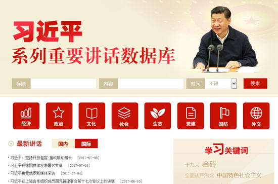 人民网·中国共产党新闻网精心打造的"习近平系列重要讲话数据库"(http://jhsjk.people.cn/),帮助你一键在手,要点全通,成为全党、全国人民认真学习习近平总书记系列重要讲话和治国理政新理念新思想新战略的金钥匙。