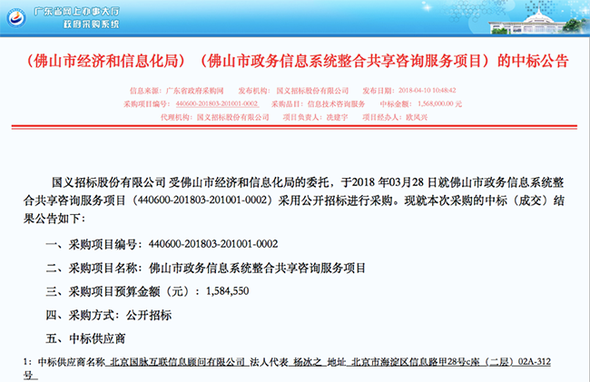 2018年4月10日,北京国脉互联信息顾问有限公司成功中标“佛山市政务信息系统整合共享咨询服务项目”。