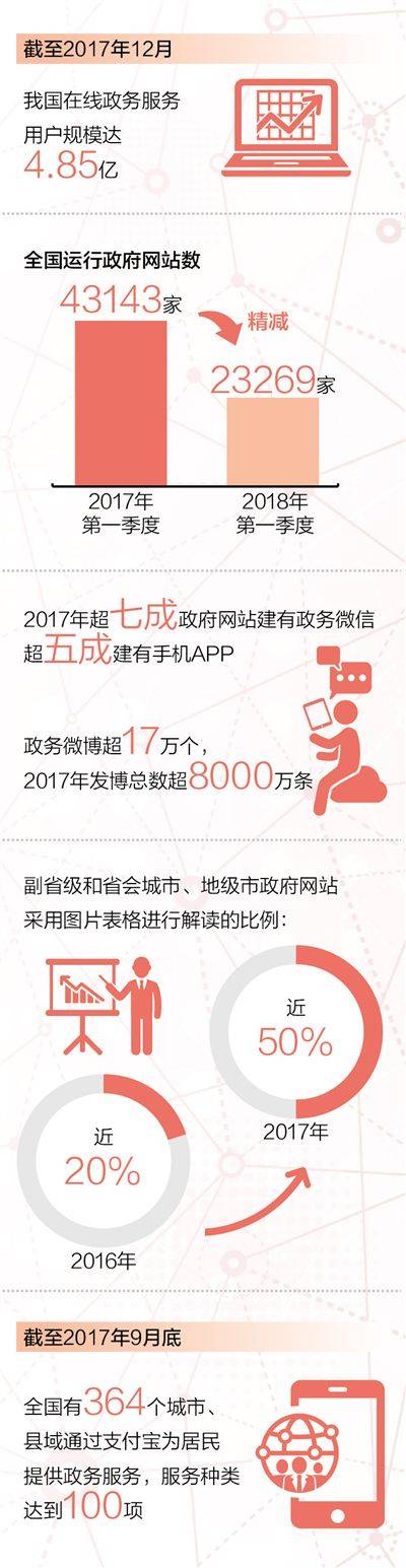 普查、抽查、整改、创新,这些年,全国政府网站“四不”问题基本解决,《政府网站发展指引》为网站怎么开办提供高标准“施工图”,网站管理水平和政务服务能力不断提升。截至今年3月1日,全国运行政府网站数达23269家。相比2017年第一季度的43143家,不到一年时间,体量“精减”一半。其中,县级以下政府网站1645家,相比2017年一季度减少九成多。