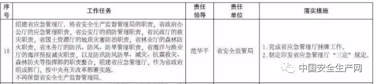 《改革方案》中将海南省安全生产监督管理局的职责,省政府办公厅的应急管理职责,省公安厅的消防管理职责,省民政厅的救灾职责,省国土资源厅的地质灾害防治职责,省林业厅的森林防火职责,省水务厅的防汛、防风、防旱管理职责,省海洋与渔业厅的海洋预报减灾职责,以及防汛防风防旱、减灾、抗震救灾、森林防火等指挥部的职责整合,组建省应急管理厅,作为省政府组成部门,按中央有关改革部署实施。