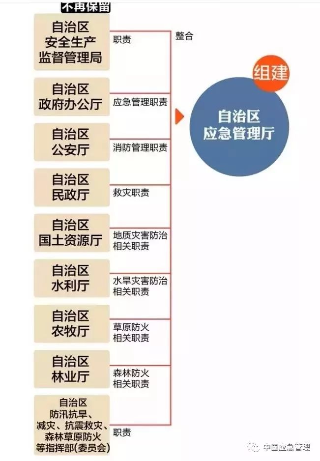 组建自治区应急管理厅。为防范化解重特大安全风险,整合优化应急力量和资源,提升防灾减灾救灾能力,将安全生产监督管理局和政府办公厅、公安厅、民政厅、国土资源厅、水利厅、农牧厅、林业厅涉及应急管理的职责,以及自治区防汛抗旱、减灾、抗震救灾、森林草原防火等指挥部的职责整合,组建应急管理厅。