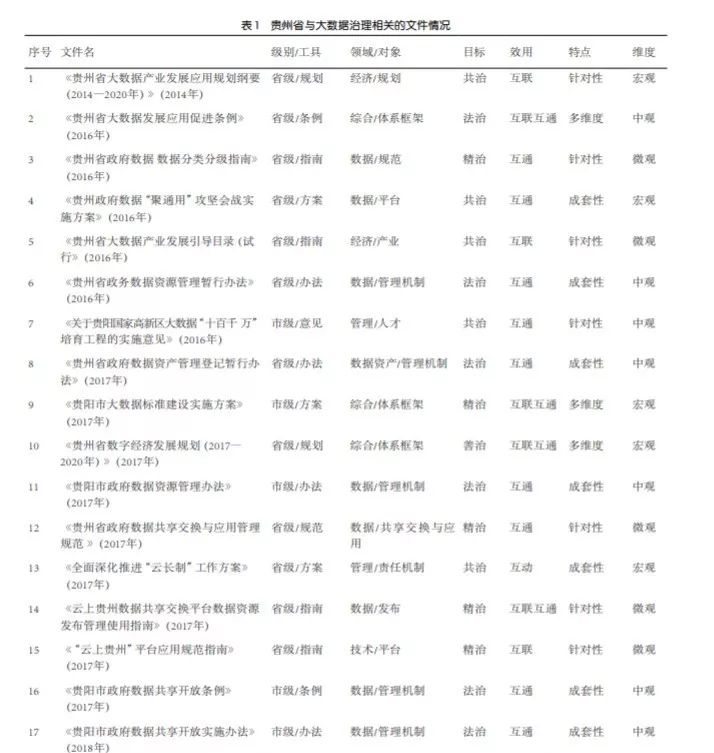 通过采用文本内容聚类分析的方法,笔者从治理层级、治理领域、治理对象、治理目标、治理效用和治理特点6个维度,对收集汇总的63份省、市级政策标准文件进行了分析,发现贵州省大数据综合治理体系建设已初具规模。在宏观层体系框架上,贵州省采用规划、计划、方案、意见等治理工具引导共治和善治,具有多维度特点;在中观层体系框架上,贵州省采用条例和办法等治理工具提供法治管控依据,具有成套性特点;在微观层,贵州省采用技术标准和指南治理工具指导互联、互通、互动精治目标的实现,具有针对性特点。整体而言,贵州省大数据综合治理体系建设初具规模,在宏观层体系框架上有善治和共治规划、计划、方案引导,在中观层体系框架上有法治条例、办法、意见、通知运行管控,在微观层技术实现上有精治标准和指南指导。贵州省与大数据治理相关的文件情况见表1。