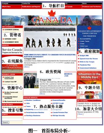 加拿大政府门户网站页面设计美观庄重、简洁明了。从首页布局来看,如图一所示可分为十大块内容。其中关于在线服务设置了三块:以用户分类为基础的在线服务、对各服务项目进行汇总编排的资源中心、对常用热点服务主题设置的快速进入通道。通过这种多渠道设置,为用户快捷的获取所需服务提供了便利。