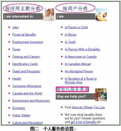 在服务内容的组织上,加拿大政府网站首先将用户对象分为加拿大人、加拿大企业、国际人士三大类,再围绕用户需要分别设置了:“个人服务”、“企业服务”、“国际化服务”三个服务栏目。