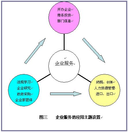 具体各主题下,服务内容大致包括:对该主题在线服务的介绍、该主题业务的基础知识、政府为该业务提供的服务、业务引导等几个部分。如图三所示,通过这种设置,本栏目为用户构建了一套围绕企业经营运作相对完整的服务体系。同时它还就政府采购、企业团体协会等进行介绍,促进政府与企业间业务上的互动。