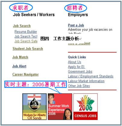 以“个人服务”栏目中的“工作”主题为例,它并不只是简单的就国家宏观的就业形势、失业率统计、就业政策等作一个概括式的介绍,而是围绕工作求职这一主题,将用户分为求职者与招聘者两大类,再针对性的为之提供一系列全方位的服务。如图四所示。