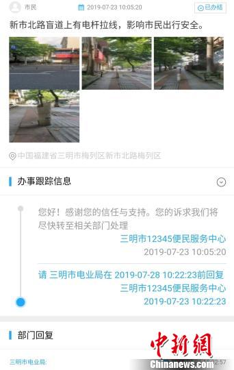 在三明市便民服务收到的众多诉求件中,一条“点赞”信息引起记者的注意。一位市民写道:“e三明”功能还是挺强大的,前天看到的诉求案件,今天就处理清楚了。供电公司响应的速度也很快,才两天时间,不仅把这条盲道上的拉线拆除了,还把旁边的电杆也拆除了,点赞!