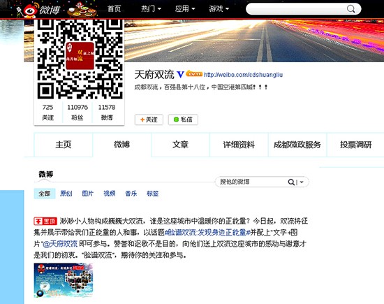 记者从双流县网信办了解到,2010年,我县开通了新浪官方微博“天府双流”,并在2011年开通了腾讯官方微博“成都双流”。自开通以来,运用活泼的语言及别具一格的长微博等图文并茂的形式发布双流信息,介绍地方特色美食、新型农村和现代幸福生活、最近城市动态等,引发了网民强烈关注和热议。2013年底,新华网撰文对我县的官方微博“天府双流”进行了点评,表扬我县“官方微博发博展示地方特色产品,打造区域名片”值得学习。