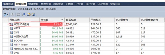 对于流量突发造成网络拥塞,我们需要弄清楚在流量突发时具体业务应用。通过回溯分析,选择流量峰值23日8:00-9:00之间的通讯数据,网络应用流量分布如下图所示: