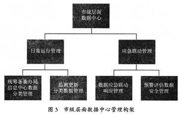 市级层面数据中心管理构架(如图3),主要分为日常运行管理及应急联动管理两类,制定统一数据信息安全管理标准、信息数据标准化格式。同时明确数据使用、数据安全、数据发布、相关者的权力、法律保护、监管机构、对数据的特殊使用、特殊使用的种类、处罚规定、过渡和最终规定等。