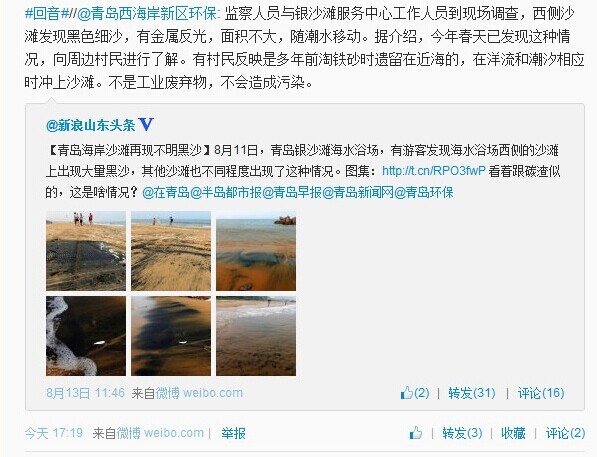 公众与环境研究中心主任马军告诉澎湃新闻,环境政务微博是公众和环保部门进行互动交流的新形势。