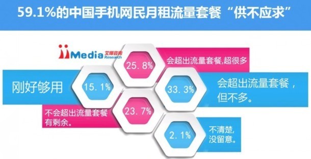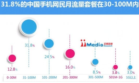 2014年11月14日iiMedia Research发布《2014年中国手机网民流量使用情况与手机流量应用工具使用体验调查报告》。iiMedia Research数据显示,2014年中国手机网民每月流量套餐额度分布上,31.8%的中国手机网民月流量套餐在30-100M内, 12.8%的中国手机网民每月手机流量套餐不超过30M。iiMedia Research分析认为,智能手机App应用数量不断增加的现状反映出手机网民在手机端对娱乐元素、即时资讯等需求的与日俱增,单个手机网民在手机流量的月使用总量上呈现上升的趋势。