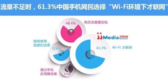 iiMedia Research (艾媒咨询)分析认为,超过半数的手机网民选择以Wi-Fi环境下联网方式解决流量不足问题,反映出大部分手机网民对于流量资费还是较为敏感;由于使用Wi-Fi的环境要求,部分手机网民还是会选择为额外产生的流量付费,付费手机网民倾向选择购买流量叠加包这一较为实惠的方式。部分App开发商设计并推出的“通过做任务等形式免费赚取流量或流量币”、实现“免费上网”的手机应用也成为部分手机网民解决流量不足的应急手段。