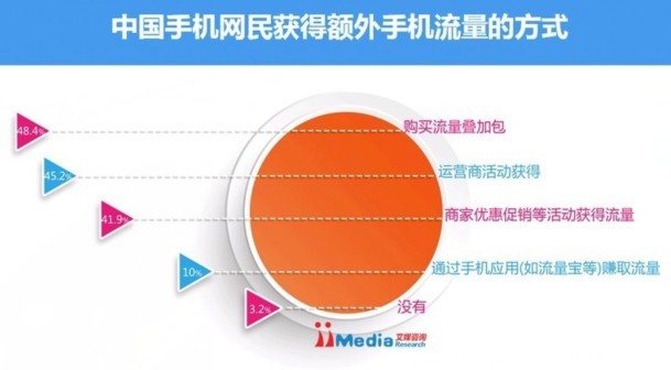 48.4%的手机网民通过购买流量叠加包获得额外流量,45.2%的手机网民通过运营商活动获得,41.9%的手机网民通过商家优惠促销等活动获得额外流量。