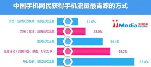 iiMedia Research (艾媒咨询)分析认为,现阶段手机网民获得额外手机流量的常用方式仍以商家导向为主,商家在推广品牌时会推出流量赠送服务,如优惠促销活动、抽奖、下载奖励等,获得赠送量和方式都由商家制定,手机网民自主操作空间较小。