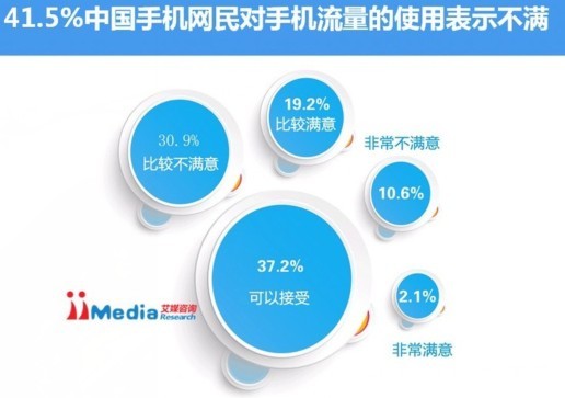 iiMedia Research(艾媒咨询)分析认为,手机流量的资费问题和手机流量使用的速度快慢、稳定程度等多重因素导致当前中国手机网民对手机流量使用的整体满意度并不高。
