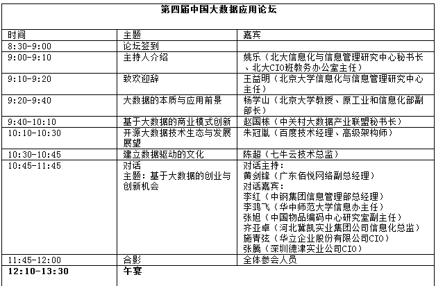 以“开源大数据技术的生态与应用”为主题的第四届中国大数据应用论坛将于2015年7月19日在北京大学隆重举办。本次论坛由北京大学信息化与信息管理研究中心和中国新一代IT产业推进联盟主办,北京大学CIO班教务办公室和北达软协办,CIO时代网承办。本次论坛将探讨主要开源大数据技术的发展趋势与应用前景,并围绕企业、政府、金融、医疗卫生等行业应用场景展开讨论。本次论坛主要讨论的议题将包括大数据的开源生态系统、大数据的技术架构、基于大数据的创业与创新、基于大数据的行业应用等。