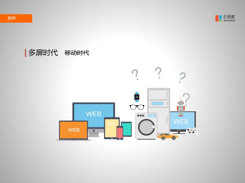 大家现在都叫移动互联网,但是在云适配的眼里,"移动互联网"的叫法已经过时了,未来我们将会进入一个新的时代,叫"多屏互联网"时代,因为未来互联网会接入的设备不仅仅是手机,还会有汽车、手表、眼镜等等。我们今天已经看到有各种各样的智能设备接入互联网,而且人们也正在使用各种各样的设备从互联网上接收信息。所以政府在做移动化、信息化的过程中,不仅仅是考虑电脑、手机,更重要的是考虑更长远的:各种各样的屏幕, 未来可能就是在汽车上、手表上、眼镜上接收政府宣传的信息。