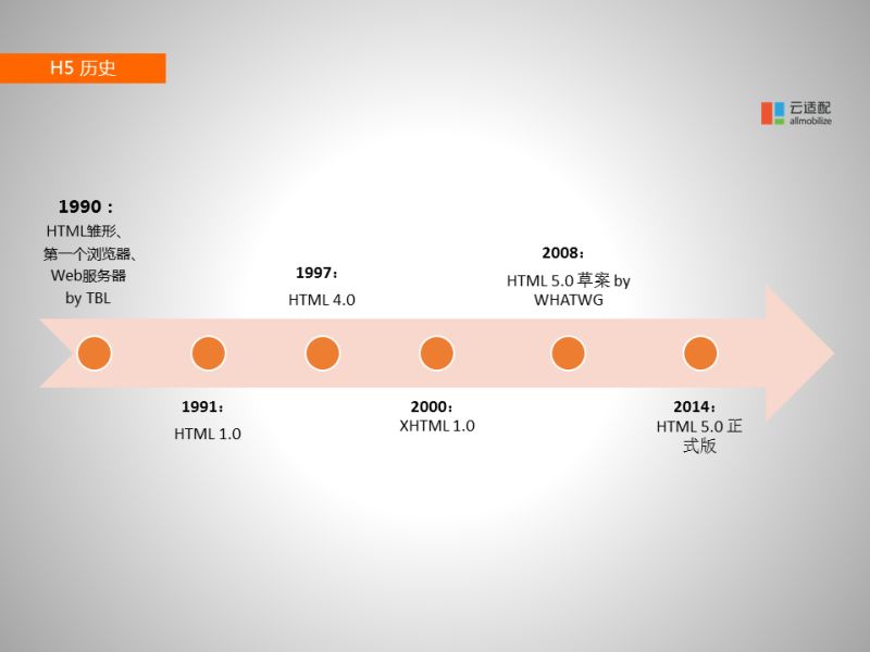 这是一个HTML发展的整个历史。大家也可以看到世界上第一个互联网雏形是1990年由欧洲一叫TBL的人提出来的。这个技术很快在科研领域得到了认可。在1991年,TML把HTML技术写成了一个正式的标准文档,就是当时的HTML1.0。很快,互联网技术迅速从科研领域蔓延到民用领域和商业领域。尤其在1994年的时候,网景公司开发了世界上第一个商用浏览器,极大程度促进了老百姓对互联网的使用。随后,微软马上也开发了IE浏览器。从1994年到1997年,网景浏览器和IE浏览器之间发生了激烈的浏览器大战,这也极大的促进了HTML标准的进步。很快,HTML进步了几个版本,到1997年进步到HTML4.0 。当然,大家都知道,最后的结局是IE浏览器彻底打败了网景浏览器,抢走了所有浏览器的市场份额,所以在IE5.5版本发布之后,基本IE浏览器就是一枝独秀了。之后HTML标准就进入了很长一段时间的平静期。这个时候W3C觉得当时的HTML设计的不够完善,所以在2000年的时候提出了XHTML,这个版本比原版HTML语法要严格很多,也加入了语义的元素进去。可惜的是,过去的HTML4.0已经根深蒂固了,很难使得整个互联网向XHTML迁移。最后W3C发现了XHTML很难推,又恰逢苹果发布了智能手机,整个市场对新一代HTML有强烈的需求。在2008年HTML联合了另一个民间组织,发布了HTML5.0的草案。