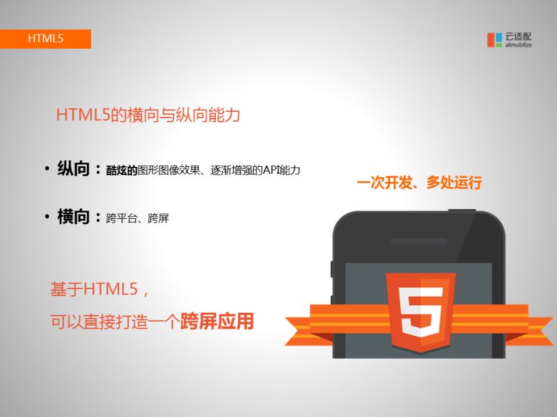 H5它的特性可以归纳成两个方向:横向和纵向。纵向就是有更酷炫的图像效果,可以做出很丰富的交互界面的应用,有很多的增强API可以让你访问摄像头、GPS。横向就是跨平台、跨屏,一次开发可以运行到很多地方,各种这样的设备上。云适配就是致力于帮您打造HTML5跨屏应用,对外让老百姓无论使用什么设备、什么平台,始终可以通过同一个网址访问到您的网站,来完成政务办公系统。对内移动办公协同系统上,每个人的手机、平台都不一样,用HTML5也是非常高效的。