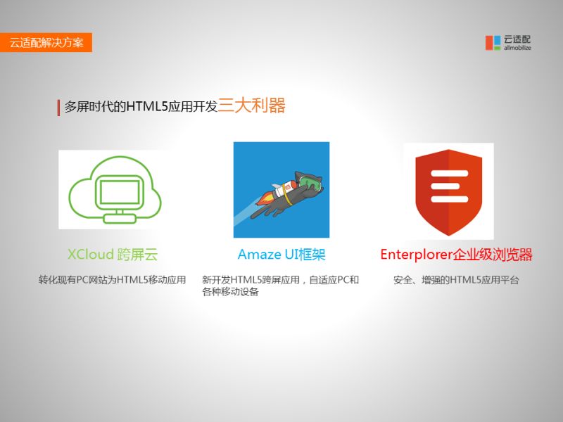 针对HTML5跨屏应用的需求,云适配提供了三大产品线。一是XCLOUD跨屏云,能够帮把现有的PC网站直接转化成HTML5的移动应用,直接实现跨屏。二是 AMAZE UI框架,这个框架开发出的HTML5应用自动适应PC和各种移动设备。第三个是浏览器,是用来运行HTML5应用,它为HTML5提供一个增强的、安全的运行平台,主要适用于移动办公的环境。
