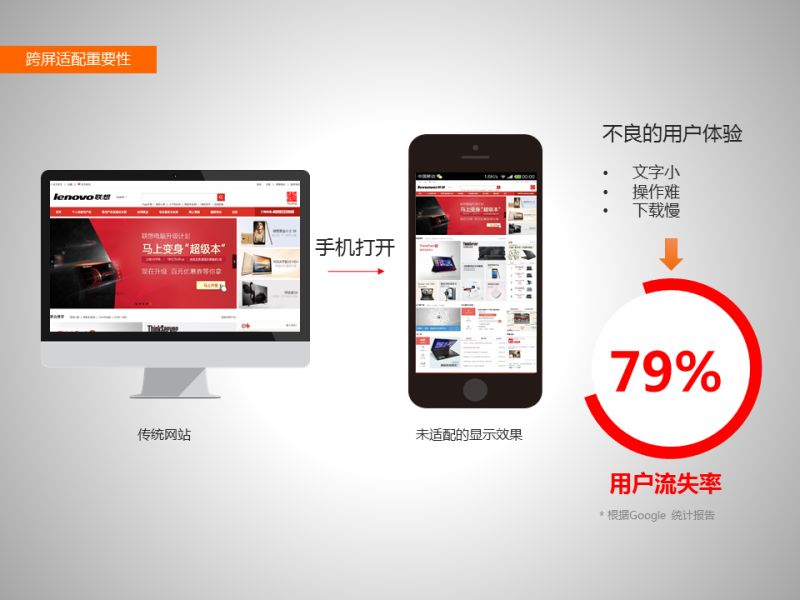 现在的网站一般是由PC开发的,在手机上打开文字和图片很小,要用双手去缩放,这个用户体验是非常差的,会导致79%的用户直接离开。跨屏云基于自主研发的国际专利技术,只要在网站上加一串代码,就可以把您的PC网站直接转化成HTML5的移动应用,并且网址不改变、内容实时更新。大家可以在手机上打开www.gov.cn 体验一下中国政府网使用云适配的效果。网址不改变是非常重要的,老百姓可以按照原来在PC上使用政务系统的方式在手机上直接访问政务系统。