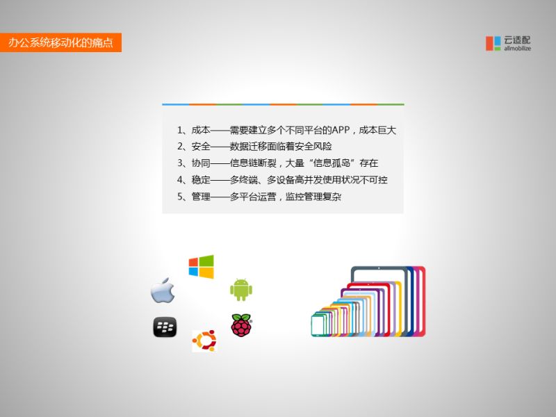 今天办公系统移动化的几个痛点:一是成本。需要为不同的平台开发不同的APP成本非常大。二是很多政府、企业都会找第三方公司开发APP,这就需要政府开放数据库接口、PC网站系统给他,这里会面临数据泄露的问题,以及在开发、迁移过程中可能会导致现有的PC系统无法工作。三是开发的APP之间都是孤岛,无法相互连接;四是稳定性。不同员工手机上APP版本不同,在访问现有系统的同时要考虑到不同的版本切换问题,对开发造成困难。同时要管理不同的平台,管理系统也是非常复杂的。