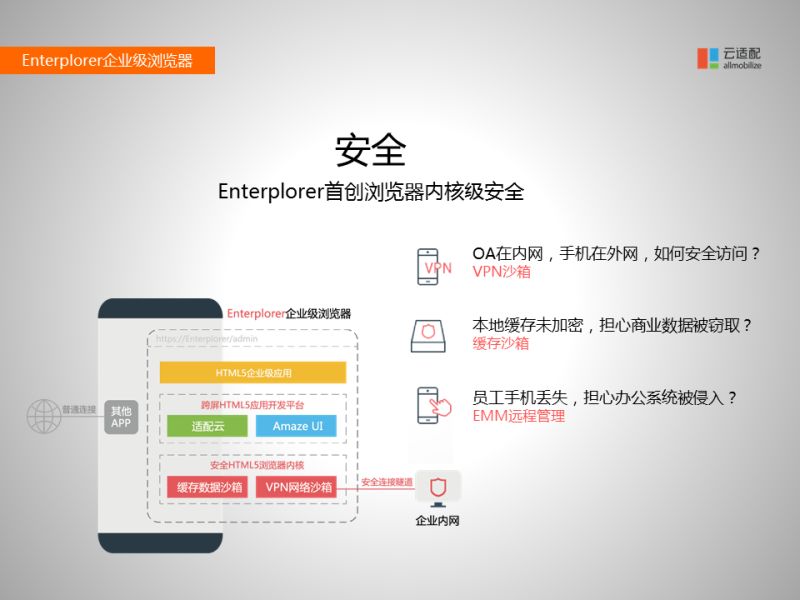 最重要的还是安全,目前市面上的浏览器都是给消费者用的,在安全上并没有下很深的功夫。很多企业的OA系统都是在内网中的,外网是无法访问的。这个在PC时代是没有问题的,但是在移动时代,领导经常要出差,需要访问内网办公系统。如何能够安全的访问到内网系统面临很大的挑战。我们的浏览器内核自带VPN,通过浏览器直接拨到内网,OA还是在内网上,很安全的。