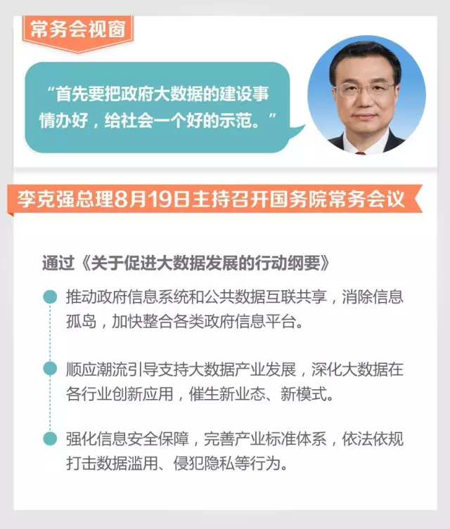 而在8月19日的常务会议上,李克强强调的第三个关键词就是“安全”。他说,互联网等行业已经在不断创新、发展大数据产业。“因此,政府既要‘扶持’,为大数据产业创造一个健康发展的环境,又要‘引导’、‘规范’,保障信息安全。”