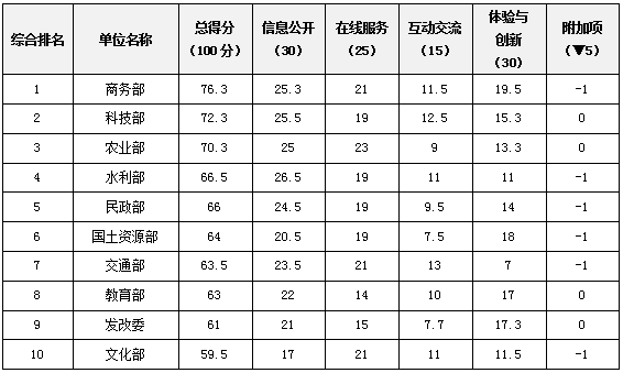 根据评估结果显示,国务院组成部门网站在主动信息公开平均得分为16.38分,平均得分率为54.6%,未达到及格水平;主动公开指标得分率为61.2%,也是唯一达到及格水平的指标。表明多数单位信息公开工作做得不够到位,缺乏全面、健全的信息公开机制。多数单位能够提供基本的在线服务,但在线服务的准确性、及时性、便捷性方面,还需要大幅提高,互动交流渠道需要健全,渠道的设置需要更多样,大多数网站的创新能力不足,体验效果不佳,在线服务与互动交流方面仍需进一步完善。