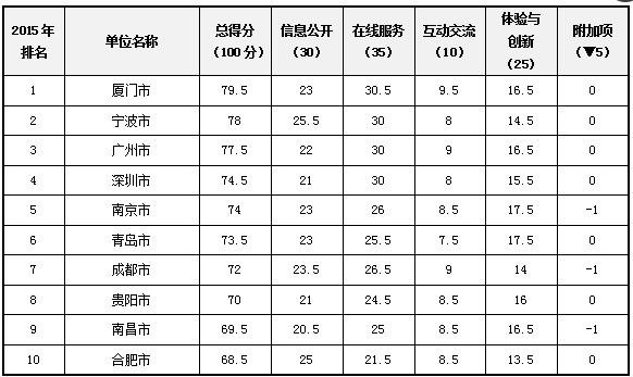 2015中国省会及计划单列市政府网站绩效评估前10名如下: