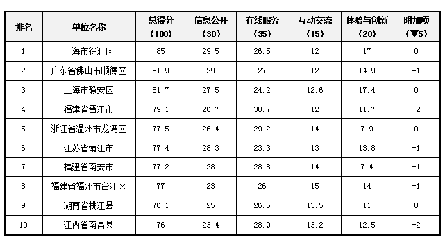2015年试点县(市、区)政府网站绩效评估前10名如下: