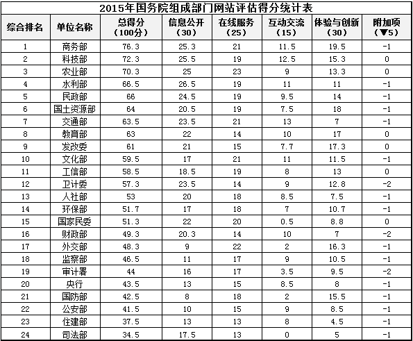 如下是2015年国务院组成部门政府网站绩效评估得分排名: