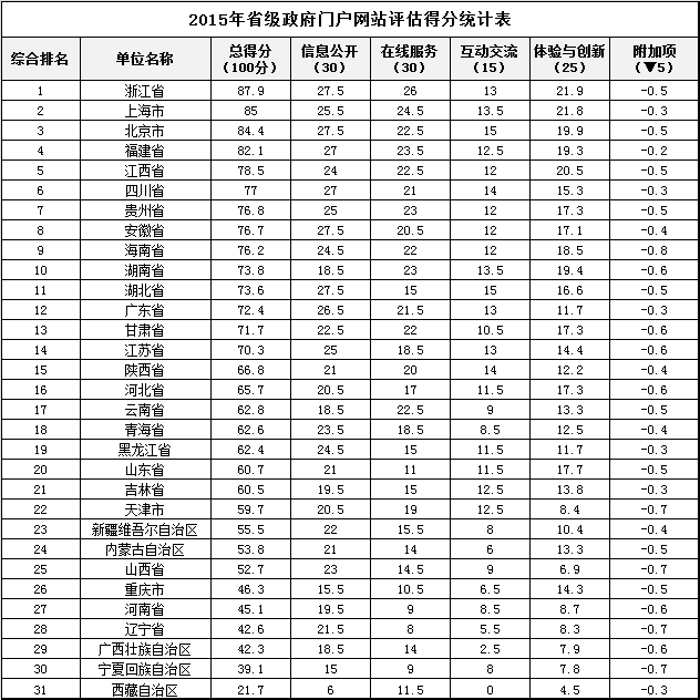 如下是2015年省级政府门户网站绩效评估得分排名: