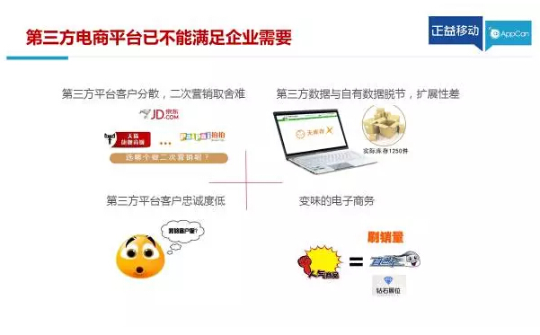 问题来了,移动电商是自建和嫁接?实际上,第三方电商平台已经不能满足需求。第三方平台客户分散、二次营销取舍难,客户忠诚度底,用户往往是平台的用户,不是企业的。此外,变味的电商,刷单才有销量,要销量就要刷单,已经是恶性循环。