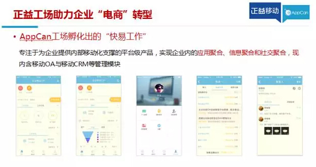 正益移动作为国内移动平台技术与移动创新服务的领跑者,拥有国内知名的移动开发和技术支撑平台—AppCan,以及移动互联网应用创新创业平台—正益工场,分别从技术和生态两个层面支撑企业的“电商”转型。
