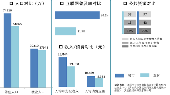乡村人口在消费水平,教育、医疗等公共服务以及网络基础设施方面与城镇居民都存在较大差距。2014年,乡村人口规模降至6.2亿,接近城镇人口规模,但人均可支配收入却不足城镇居民的4成。农村居民消费水平为0.87万,仅占城镇居民的34.4%;农村每万人拥有的卫生技术人员、注册护士和医疗机构床位数与城镇居民的比例均在30.0%-45.0%区间;城镇与农村地区的互联网普及率分别为64.2%、30.1%,相差34.1个百分点。
