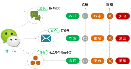 微信通过农村与城市、农业与市场、农民与平台的连接,为“三农”发展赋能,发挥弥合城乡差距、激活农业、重塑农民的价值。
