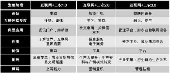 近年来,随着我国农村制度改革的不断推进和农业经济的快速发展,“三农”领域的整体发展水平在一定程度上得以提升。“互联网+”作为新常态下推动生产方式转变和生产效率提升的强力引擎,正逐步渗透到行业发展以及社会运转的每一个环节中,在弥合城乡差距、倒逼“三农”改革方面初见成效。但同时我们也应清醒地认识到,城乡数字鸿沟、农村信息孤岛等现象依然存在,诸多“互联网+”三农应用与模式尚在探索,在用户习惯、思维、能力方面的培养尚需继续加强。通过研究,“互联网+”三农可分为三个阶段,并在上网设备、互联网接受程度、典型应用、作用、价值、影响、障碍等方面呈现不同特征。