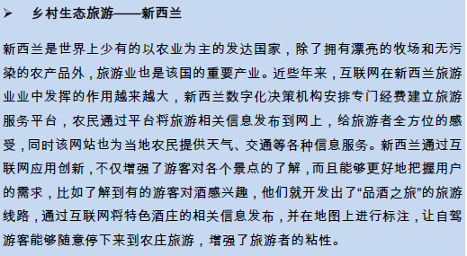近年来,休闲农业这一概念逐渐为人们所熟识,并与度假、健身、文化娱乐等活动相互结合,由最初提供单一的观光型旅游产品转向提供吃、住、行、游、购、娱为一体的综合旅游服务,形成了一定的市场规模和较为完善的产业发展体系。在互联网快速发展的今天,休闲农业也积极触网,农户们通过自建网站或入驻旅游平台的方式,大力推广基于互联网的O2O乡村旅游模式,在线为游客提供更加人性化的服务。这不仅深度挖掘了乡村生态、旅游观光和文化教育的价值,而且帮助农民取得了可观的收入。
