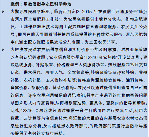 靠经验种田、市场信息不对称的时代正在远去:微信通过服务号和订阅号实现了农民与专家、农民与市场的连接,逐步形成了集农业信息发布、农产品宣传、农资信息查询和农业生产咨询服务为一体的综合移动服务窗口,为农民开展农业生产活动提供专业指导。