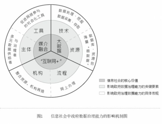 大数据是指大小超出了典型数据库软件工具收集、存储、管理和分析能力的数据集,具有容量大、多样性、速度快和构成复杂等特性;政府治理能力是政府管理社会事务、服务大众需要、平衡社会矛盾、促进社会稳定发展的所有潜在的或现实的能量或力量的有机整体,具体包括价值塑造、资源聚集、网络构建、流程创新和问题回应等能力。因此,政府数据治理能力,特指政府收集、分析以及应用数据达到上述目标或行为的力量。它是在信息社会和大数据时代中,政府调节经济社会职能、服务于经济社会发展能力的重要体现,关系到国家和社会的现代化建设,与公众的幸福指数紧密关联。