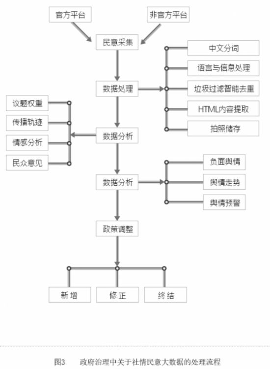 在大数据时代的背景下,各地纷纷展开试验。2014年10月,惠州市提出要运用现代信息技术等手段,深度整合网络问政、“惠民在线”论坛、“向书记说说心里话”等平台资源,建立“惠州社情民意信息库”;2015年3月,佛山市南海区打造工会移动APP服务平台,收集基层工会和职工关心的热点话题;2016年2月,广西壮族自治区提出要运用信访大数据,开展社情民意综合分析;2016年5月,山东省政协联合济南市12345市民服务热线和IT企业共建社情民意大数据共享和分析平台,尝试用大数据技术来关注民生、分析民意、研究热点;等等。根据地方政府经验,现将通用的手段和程序归纳整理为图3。