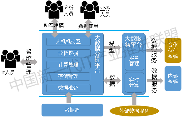 我们先看未来走到哪里。大数据的发展最终是智慧化,所以未来应该是以服务的方式嵌入到具体的业务中去。所以未来企业都应该有一个大数据服务平台,这个大数据服务平台通过实时的计算处理,实时响应各业务系统所需要的数据服务。大数据服务平台需要的数据、算法模型又从哪里来呢?答案就是大数据分析平台,分析平台包括数据准备、存储管理、计算处理、分析挖掘、人机交互等内容。也就是从未来的企业大数据平台包括大数据分析平台和服务平台。分析平台着重是离线数据的加工处理、算法模型的研发以及实现挖掘结果的交互;而服务平台着重在在线数据服务,直接为各业务环节提供在线的数据服务。如下图所示: